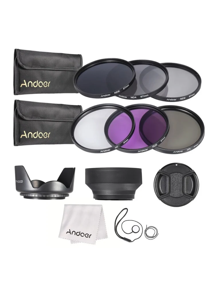This review dives deep into the Andoer 67mm Lens Filter Kit, a comprehensive package offering UV, CPL, FLD, and ND filters (ND2, ND4, and ND8) alongside a handy carrying pouch, lens caps, a lens cap holder, lens hoods, and a cleaning cloth. After weeks of testing under various lighting conditions and shooting scenarios, I’m ready to share my experience and insights.