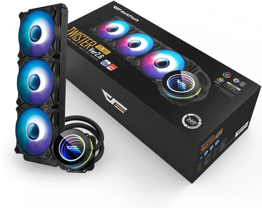 The darkFlash Twister DXV2.6 is a 360mm liquid CPU cooler that aims to provide efficient cooling and a stylish aesthetic. It features three ARGB 120mm PWM fans, an Infinity Mirror design with 360-degree rotation, and compatibility with both Intel and AMD platforms. Let’s dive into the specifics.