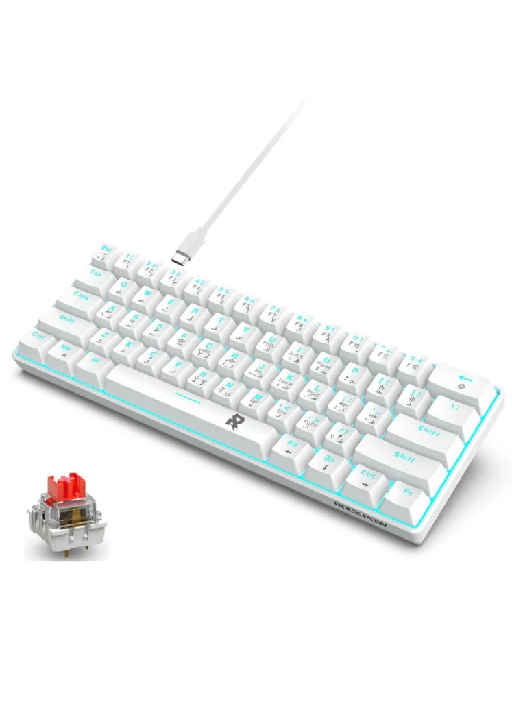 The MK61 immediately impresses with its compact size. The 60% layout is incredibly space-saving, perfect for smaller desks or those who frequently travel. The detachable USB-C cable is a welcome addition, enhancing portability further. The ice-blue backlight provides a pleasant ambiance, especially in low-light conditions, and isn’t overly distracting. The bilingual Arabic and English keycaps are well-executed, allowing for seamless transitions between languages. The red switches, while not my personal preference, are undeniably popular for their responsiveness and speed.