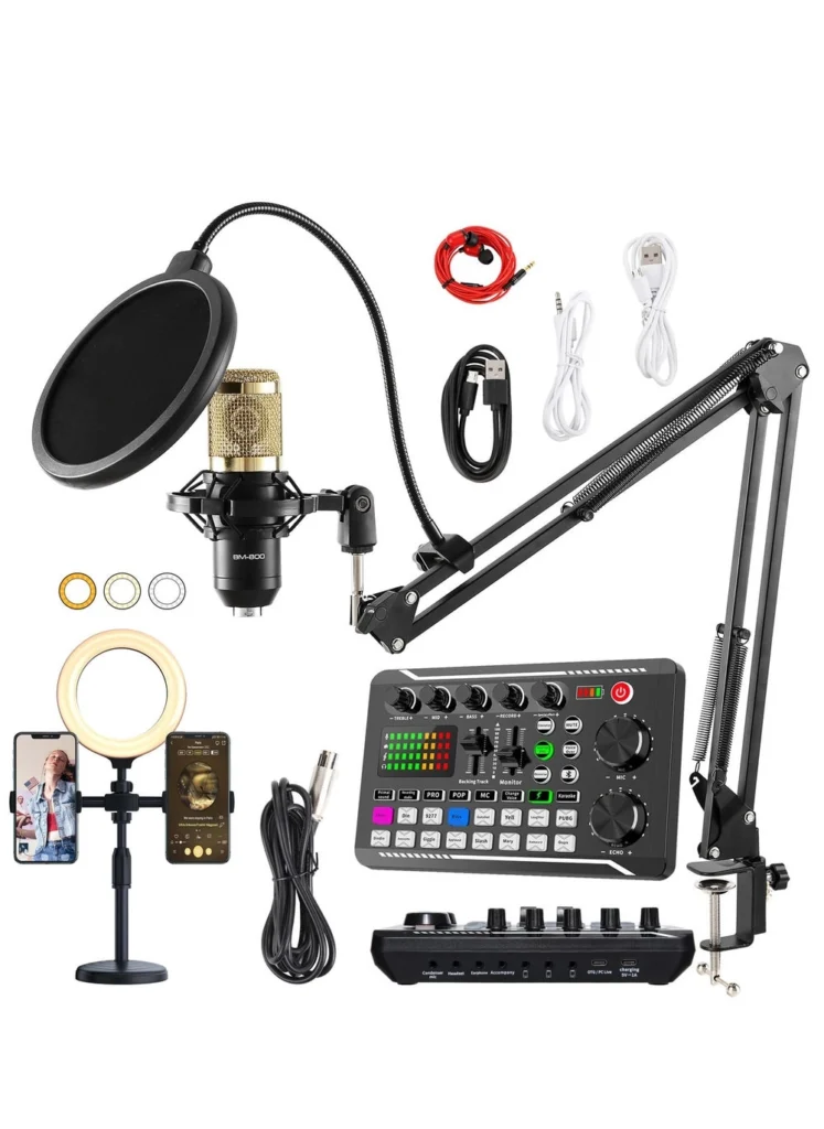 This bundle is a compelling package for its price. It includes the BM-800 condenser microphone, which boasts a high signal-to-noise ratio and impressive specifications, as well as a versatile SINWE F998 professional audio mixer with a wealth of features. The mixer offers sixteen fixed background sound effects, multiple recording modes, voice changer options, and essential audio processing tools like noise reduction. Rounding out the package is a sturdy desktop microphone stand, earbuds, and several data cables – everything you need to get started right out of the box.