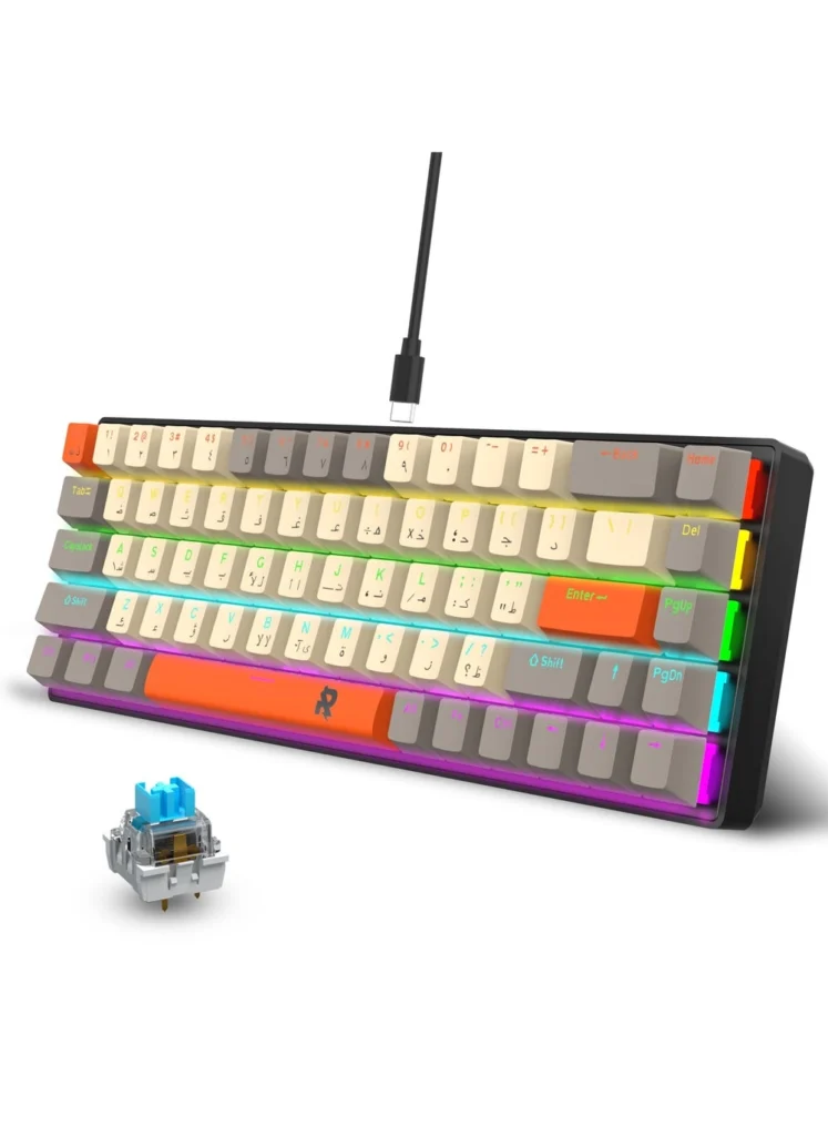 The MK68 packs a lot into its small frame. The bilingual layout is a standout feature, catering to users who need both Arabic and English characters. The mechanical blue switches provide a satisfying tactile click, which is perfect for those who enjoy the feedback. The RGB backlighting is vibrant and customizable although not extensively so. The compact design, featuring a 68-key layout with separate arrow keys, is ideal for those with limited desk space. The detachable USB cable is a nice touch for portability and cable management.