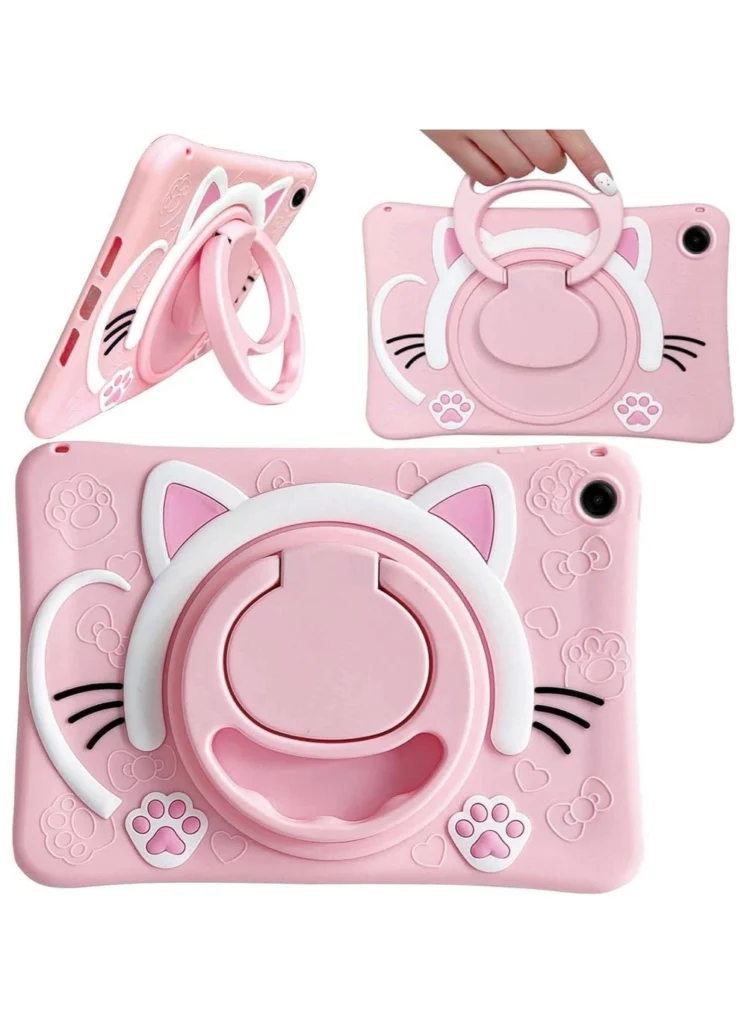 The case boasts a 360° rotating handle and integrated kickstand – features designed for both entertainment and portability. The cat design is indeed adorable, appealing to my children and softening the sometimes harsh lines of a tablet. The material, described as silicone, felt pleasant to the touch; a soft, non-slip grip. The pink color is vibrant and eye-catching, though other colors would be a welcome addition.