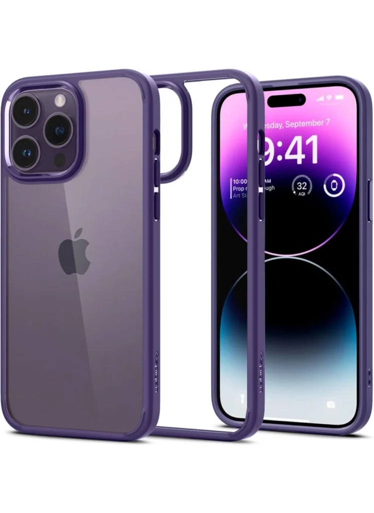 The Ultra Hybrid case boasts several key features: a hybrid design combining a flexible bumper and a rigid, transparent back; Air Cushion Technology for shock absorption; and compatibility with wireless charging. The deep purple color is surprisingly elegant and adds a touch of personality to the otherwise sleek iPhone 14 Pro Max.