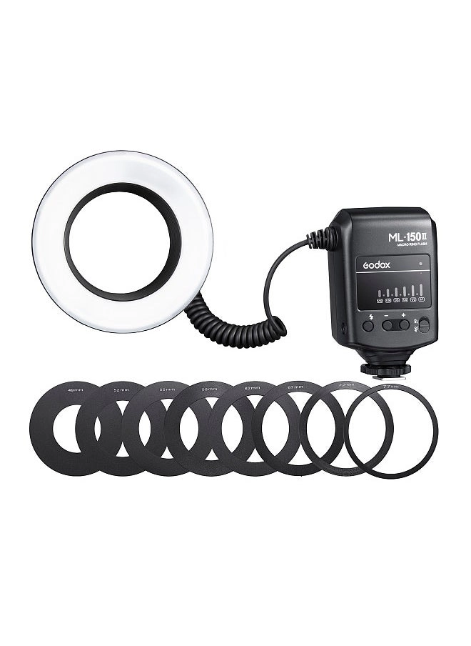 The ML-150II’s key selling points are its adjustable brightness, multiple adapter rings, and user-friendly design. The 11 brightness levels offer significant control over light intensity, allowing for precise adjustments depending on the subject and environment. The inclusion of eight adapter rings (49/52/55/58/62/67/72/77mm) ensures broad compatibility with a wide range of lenses. The compact and lightweight design makes it convenient for on-location photography.